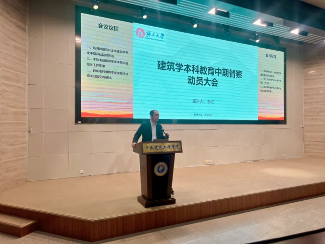 会议伊始,杨海峰副院长主持动员讲话。他开宗明义地强调,专业中期评估既是教育部对学科专业办学质量的阶段性检验,更是学院建筑学专业总结建设成果、查找发展短板、优化人才培养体系的重要战略契机。他要求全体师生切实提高思想站位,充分认识评估工作的重要性与紧迫性,以“精益求精、追求卓越”的态度全身心投入筹备工作;希望教师团队精准锚定评估指标,细化任务分工,夯实教学基础,凸显专业特色;呼吁同学们主动参与、积极配合,以良好的精神风貌和扎实的专业素养,充分展现建筑学专业学子的优良风采。