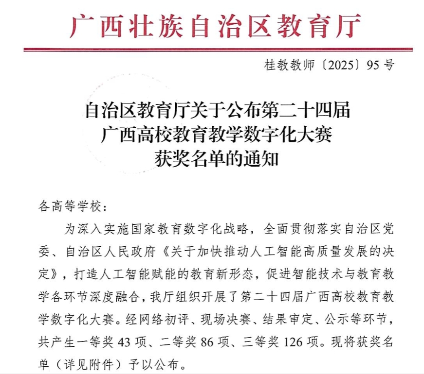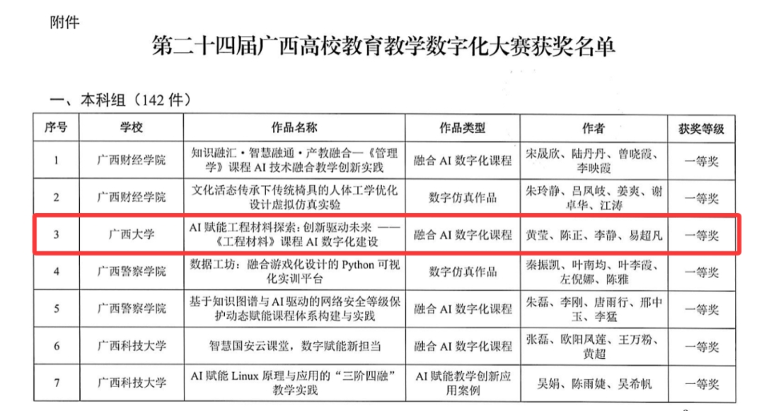 2025年5月份,为深入实施国家教育数字化战略,广西壮族自治区教育厅主办了第二十四届广西高校教育教学数字化大赛。大赛以构建人工智能时代教育新生态为目标,探索AI驱动下的教学模式重构、教学场景智能化升级和教学评价范式创新,推动人工智能技术与教育教学全要素、全流程深度融合,设立了“AI赋能教学创新应用案例”“融合AI数字化课程”“数字仿真作品”三大赛项。12月23日,广西壮族自治区教育厅公布大赛获奖名单,我院教师黄莹代表教学团队,凭借工程材料课程的数字化教学设计与精彩展示,经网络初评、现场决赛和会议审定等多轮严格评审,从全区70多所高校推荐的425件参赛作品中脱颖而出,斩获融合AI数字化课程赛项一等奖,充分展现了我院在数字化、AI融合课程改革领域取得的成果。