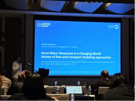2025年11月在桂林和重庆举办的国际岩溶培训班围绕岩溶水文动力学、碳氮迁移机制等水安全前沿议题,系统讲授了岩溶水文动态特征解析方法。团队成员深入学习了野外试验场长期定位观测技术、同位素示踪原理及水文数值模型构建方法,掌握了水、碳循环与生态系统相互作用的理论基础。培训期间,德国德累斯顿大学Andreas Hartmann教授系统回顾了全球变化背景下岩溶水资源模拟的研究进展,重点介绍了水流与溶质运移模型在不同尺度岩溶含水层中的适用性与局限性;成都理工大学肖先煊教授则聚焦地下水位下降与负压作用对塌陷灾害的诱发机制,揭示了工程活动扰动下岩溶地面塌陷的演化路径。这些知识使团队深入把握岩溶区水资源演变规律,为西部陆海新通道岩溶生态脆弱区水资源研究提供了关键分析工具,有效支撑了地表-地下水连通机制的科学观测,显著提升了岩溶地质工程实践的针对性与科学性。