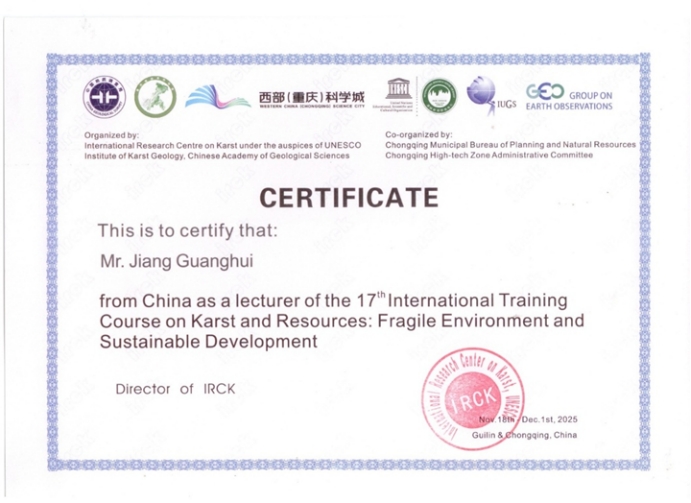 联合国教科文组织国际岩溶研究中心于2025年11月18日至24日在中国桂林与重庆成功举办“岩溶地下水工程与安全”国际培训班。来自全球15个国家的36名专家学者围绕岩溶水文动力学、碳氮迁移机制、地质灾害防治及水资源管理等核心议题展开深入研讨,通过系统理论学习与桂林丫吉试验场、重庆金佛山实地考察,深化了对岩溶系统动态响应机制的科学认知。本次培训为西部陆海新通道建设中岩溶地质条件的工程应对提供了重要理论支撑,有力促进了中国岩溶研究参与国际标准制定领域的持续进展。