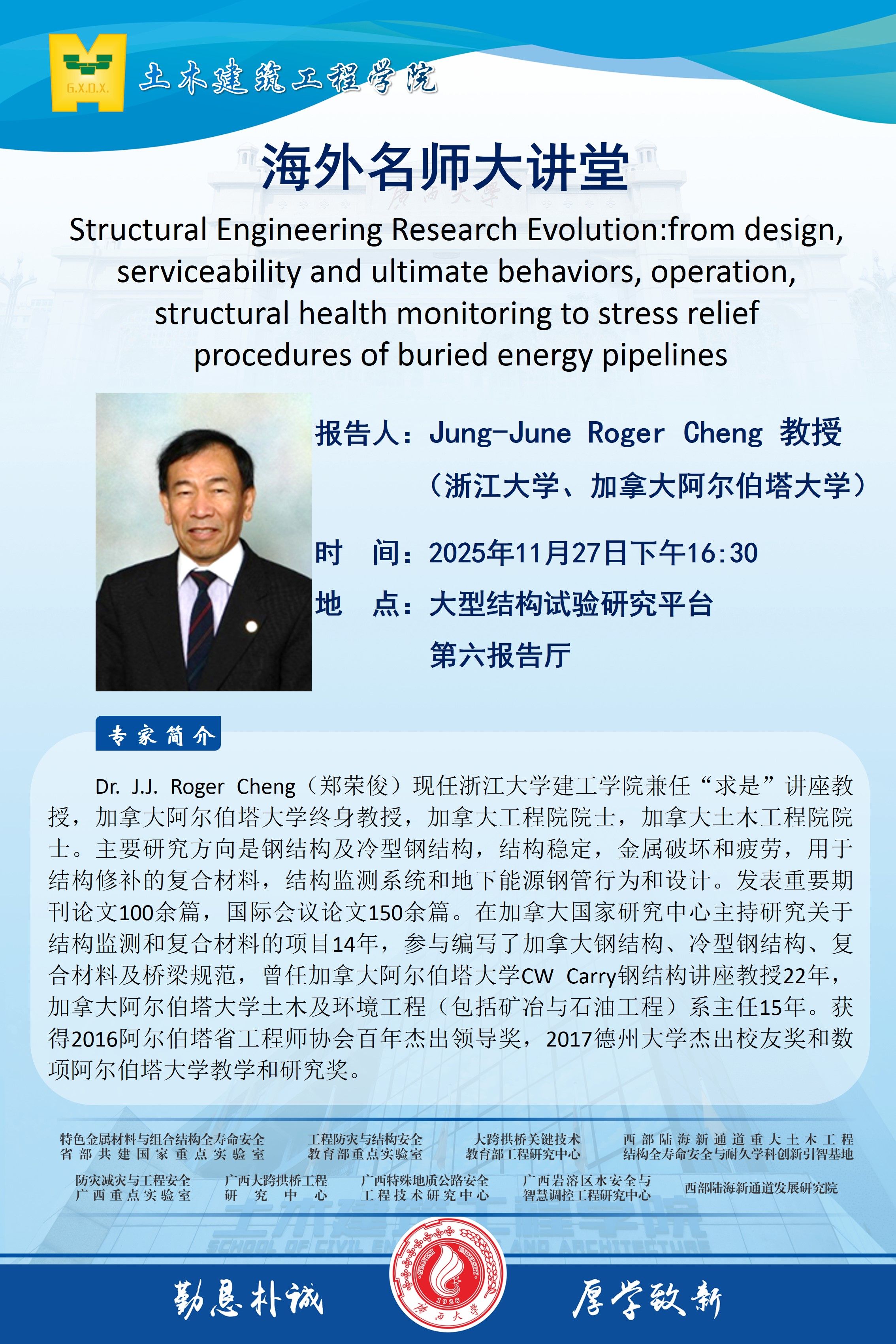 Jung-June Roger Cheng教授学术报告:Structural Engineering Research Evolution:from design, serviceability and ultimate behaviors, operation, structural health monitoring to stress relief procedures of buried energy pipelines
